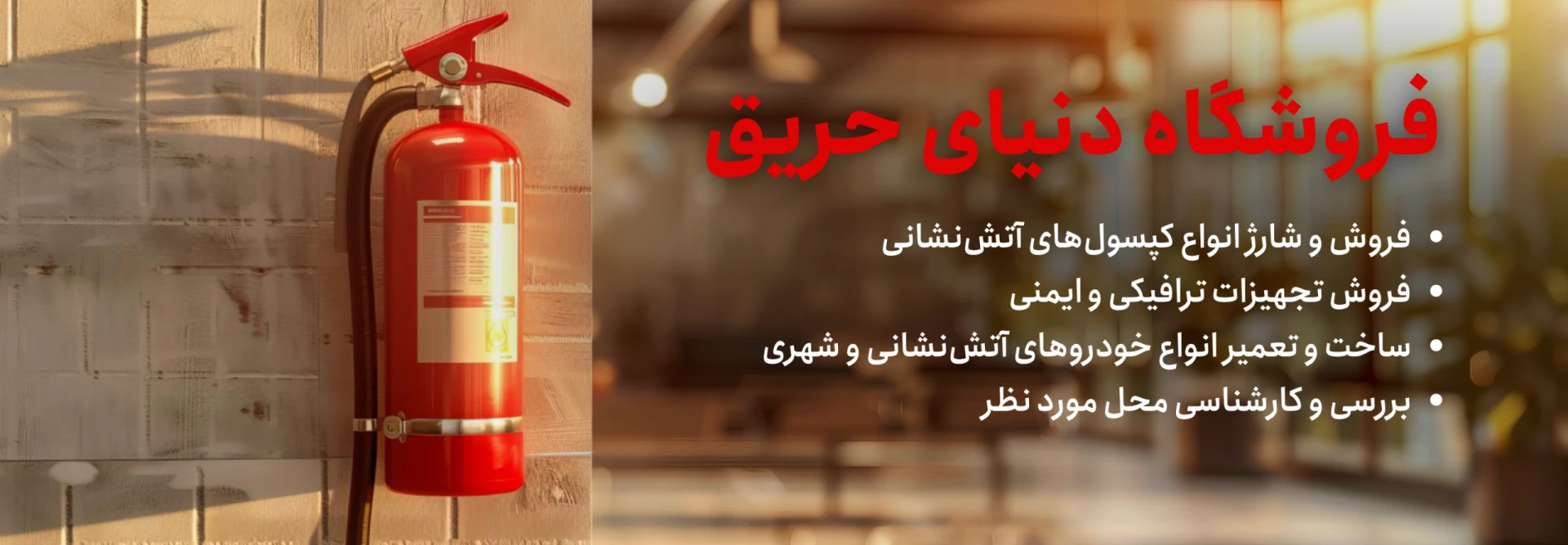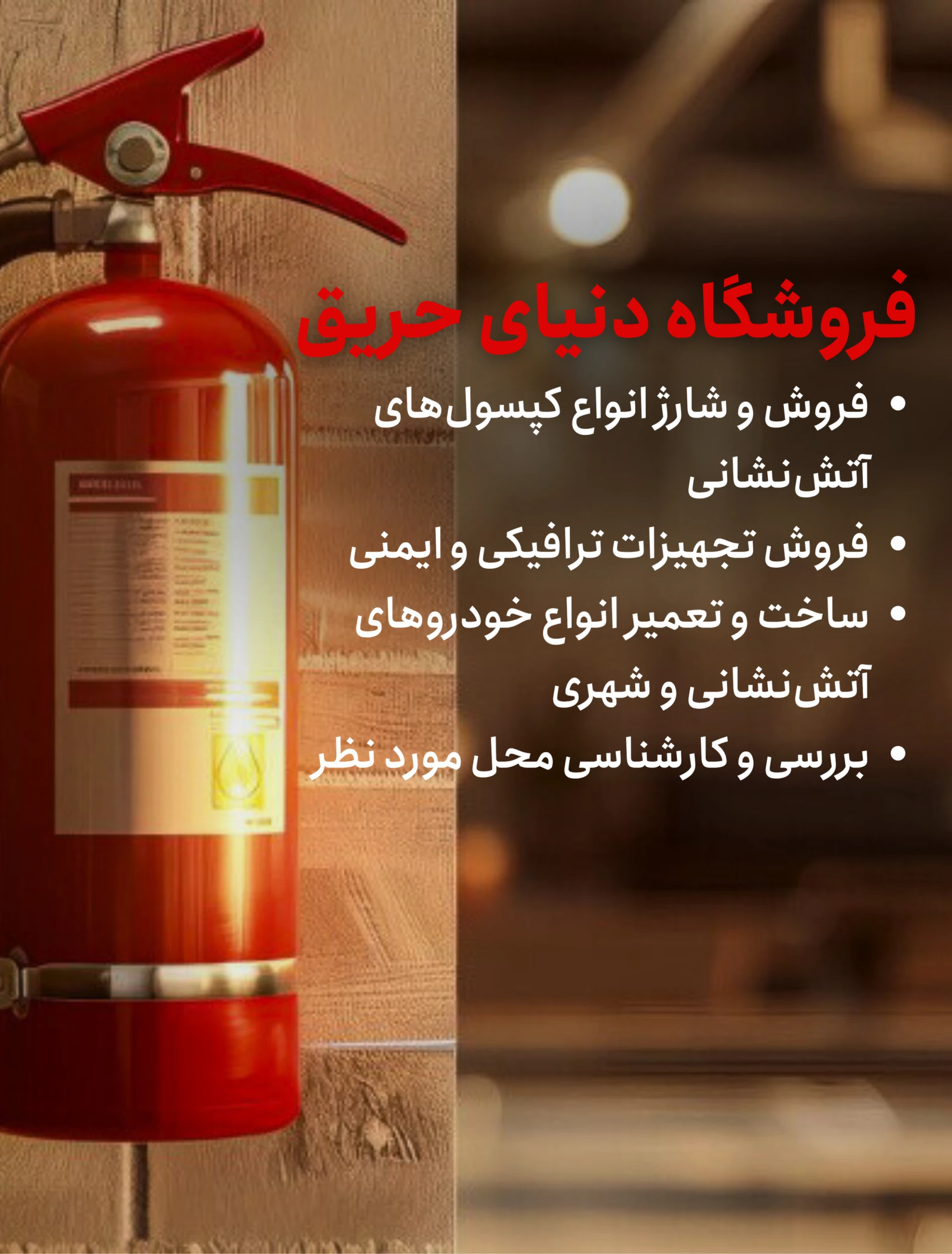 شارژ و فروش انواع کپسولهای آتش نشانی، نصب و راه اندازی انواع سیستمهای اعلان حریق، ساخت، نصب و راه اندازی انواع بوستر پمپهای آتش نشانی، فروش کلیه محصولات ترافیکی؛ از جمله خدمات ما میباشد.