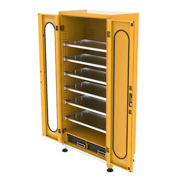 این کمدها معمولاً با قفسههای قابل تنظیم، کشوهای ایمنی دارای قفل مجزا و درهای شیشهای یا پلیکربنات سخت (در مدلهای غیرخطرناک) عرضه میشوند تا اپراتور بتواند محتویات را بدون باز کردن در مشاهده کند. استفاده از قفلهای مستحکم، دسترسی افراد غیرمجاز را به شدت محدود میسازد.